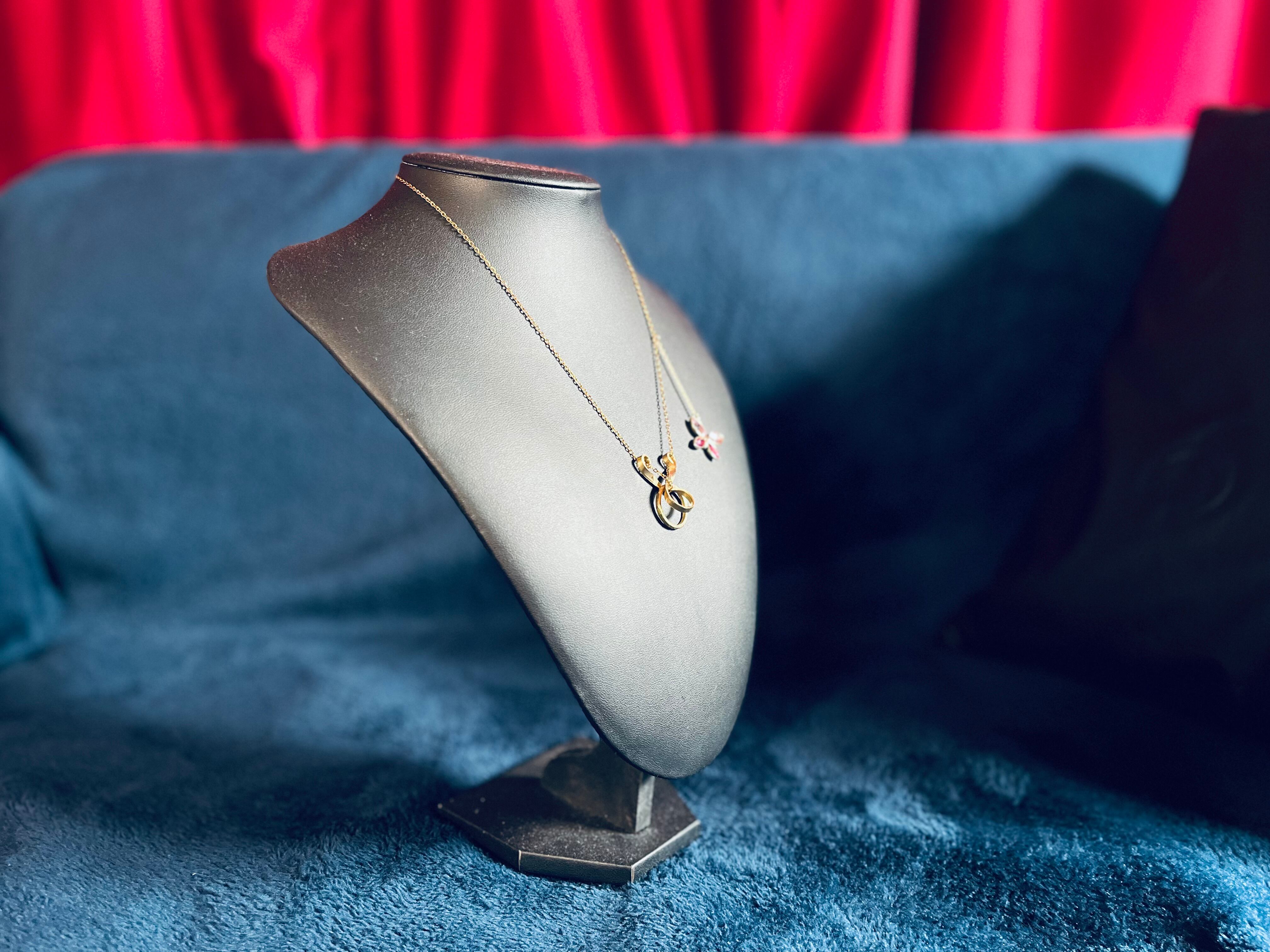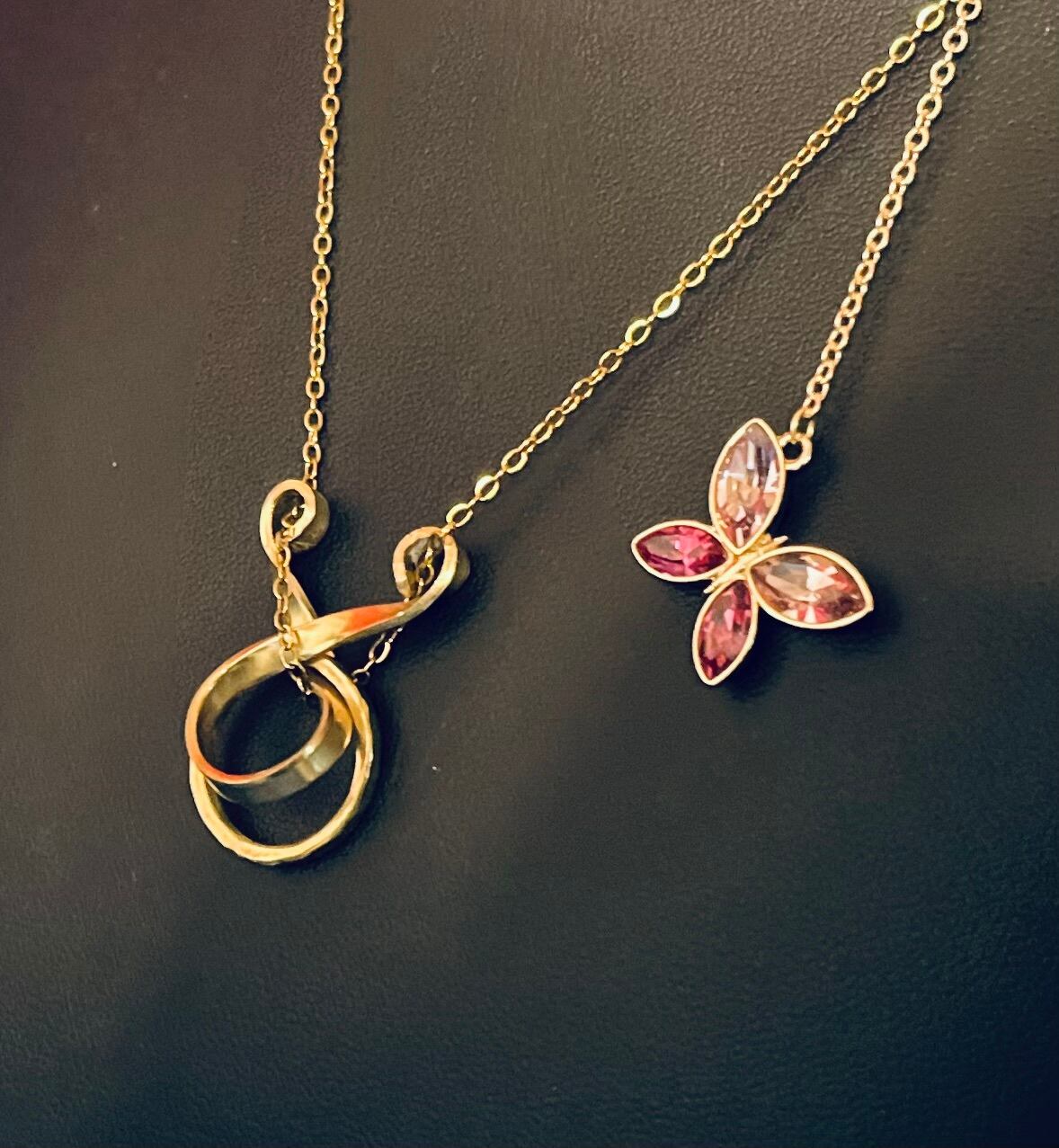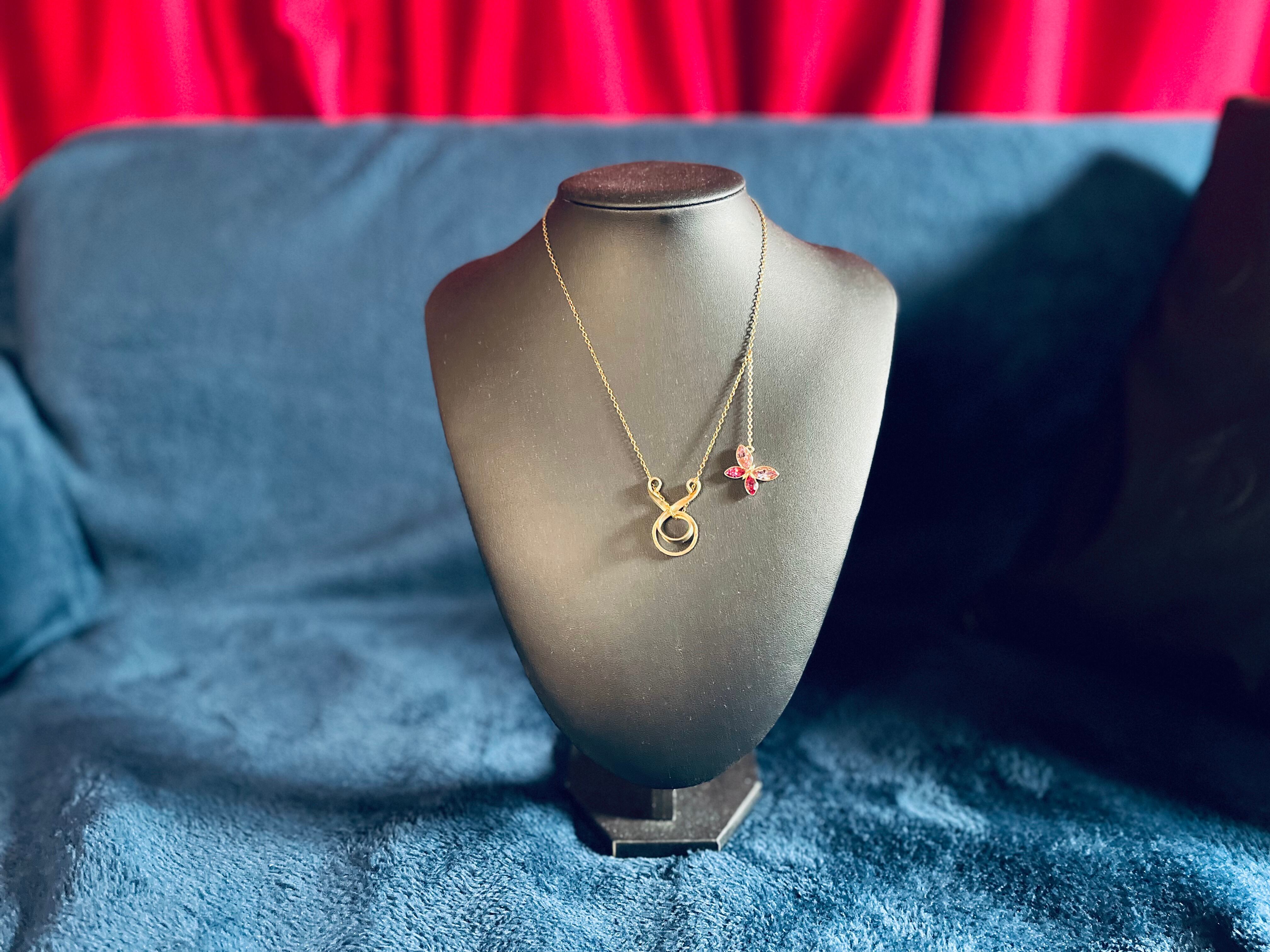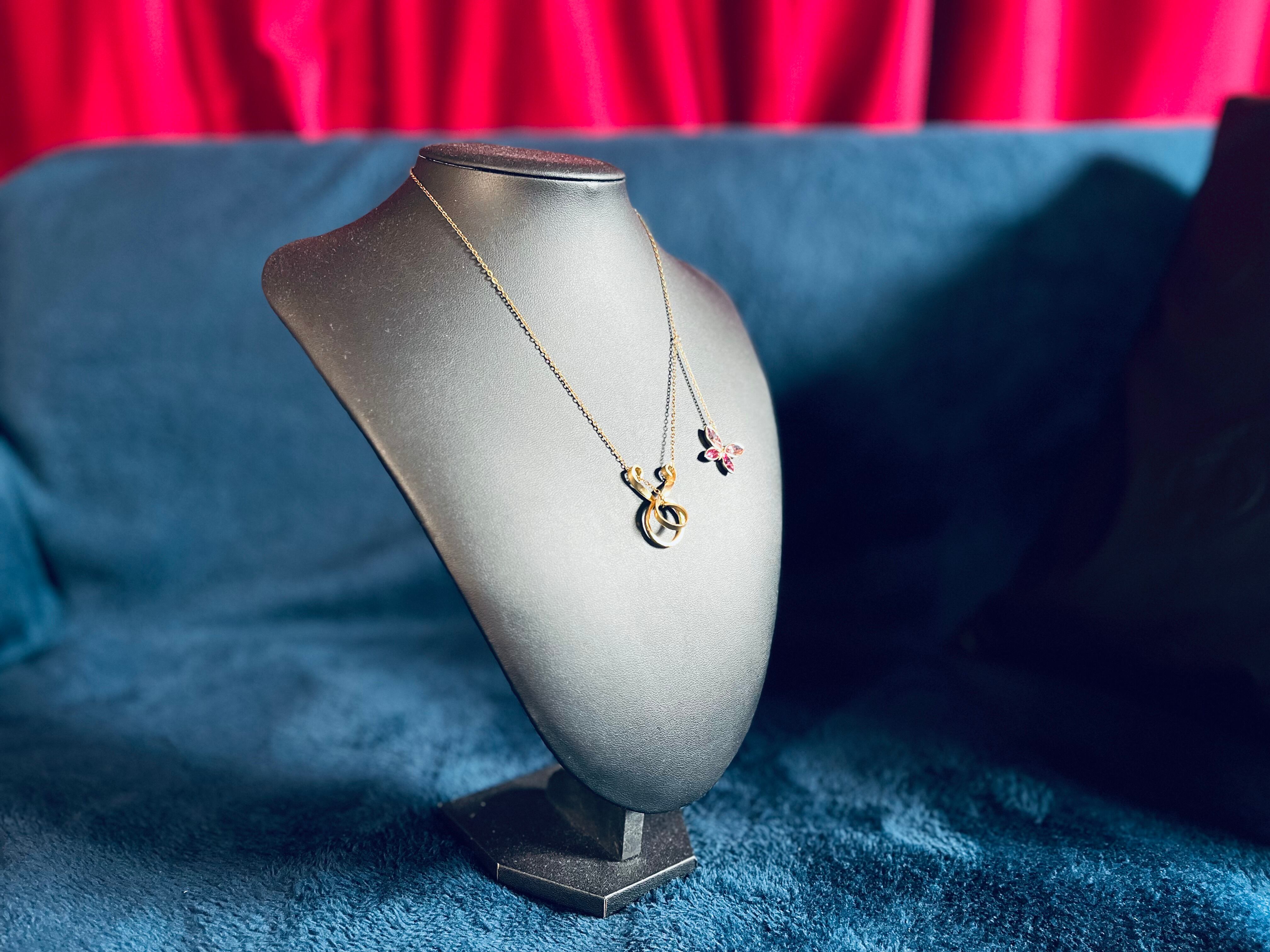• アシンメトリーな美しさ:中央のリングパーツからあえて位置をずらして配置した、紫の蝶のチャームがアクセント。首元に絶妙な動きとエレガンスを与えます。